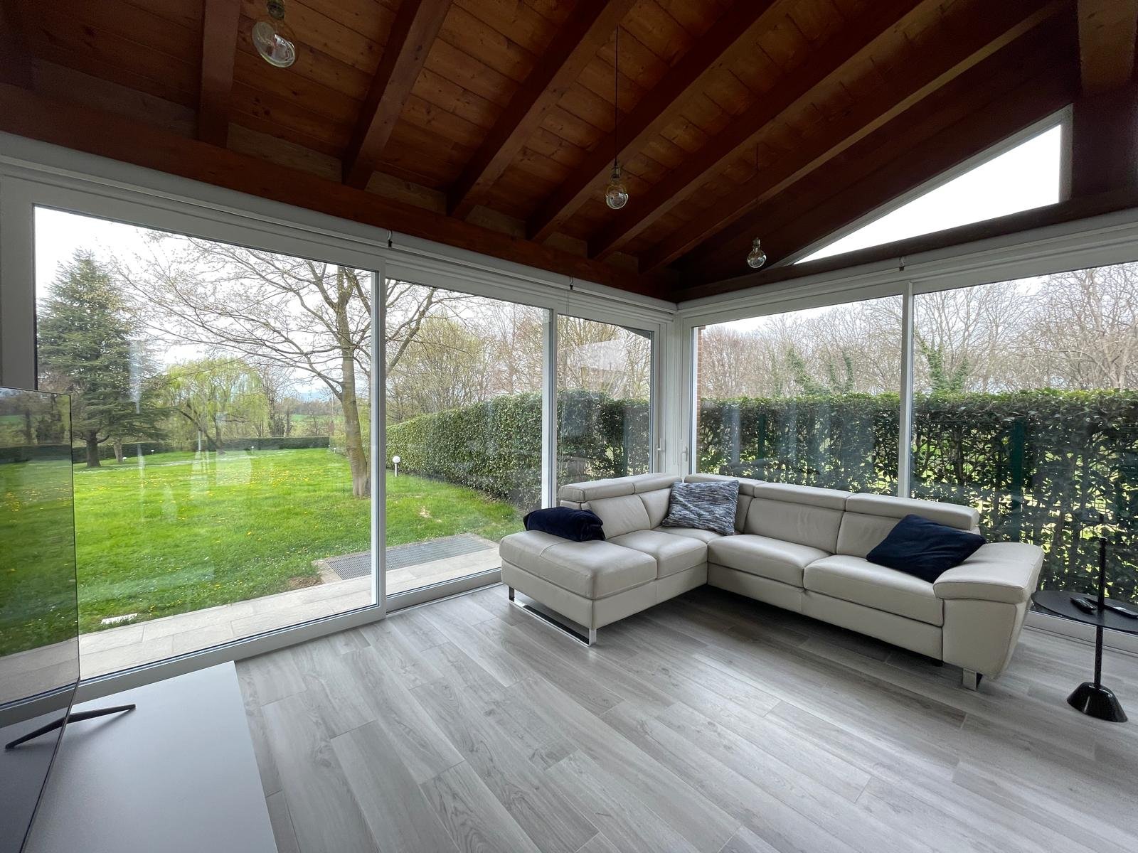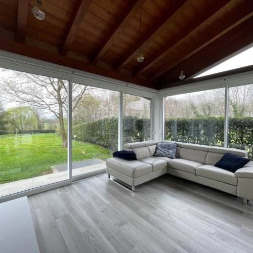 Un portico può trasformarsi in una vera e propria stanza da vivere ogni giorno: uno spazio accogliente dove trascorrere momenti in compagnia o rilassarsi e recuperare energia. In questo progetto, il valore aggiunto era il contesto: un bellissimo parco esterno, da vivere visivamente in ogni momento della giornata.
